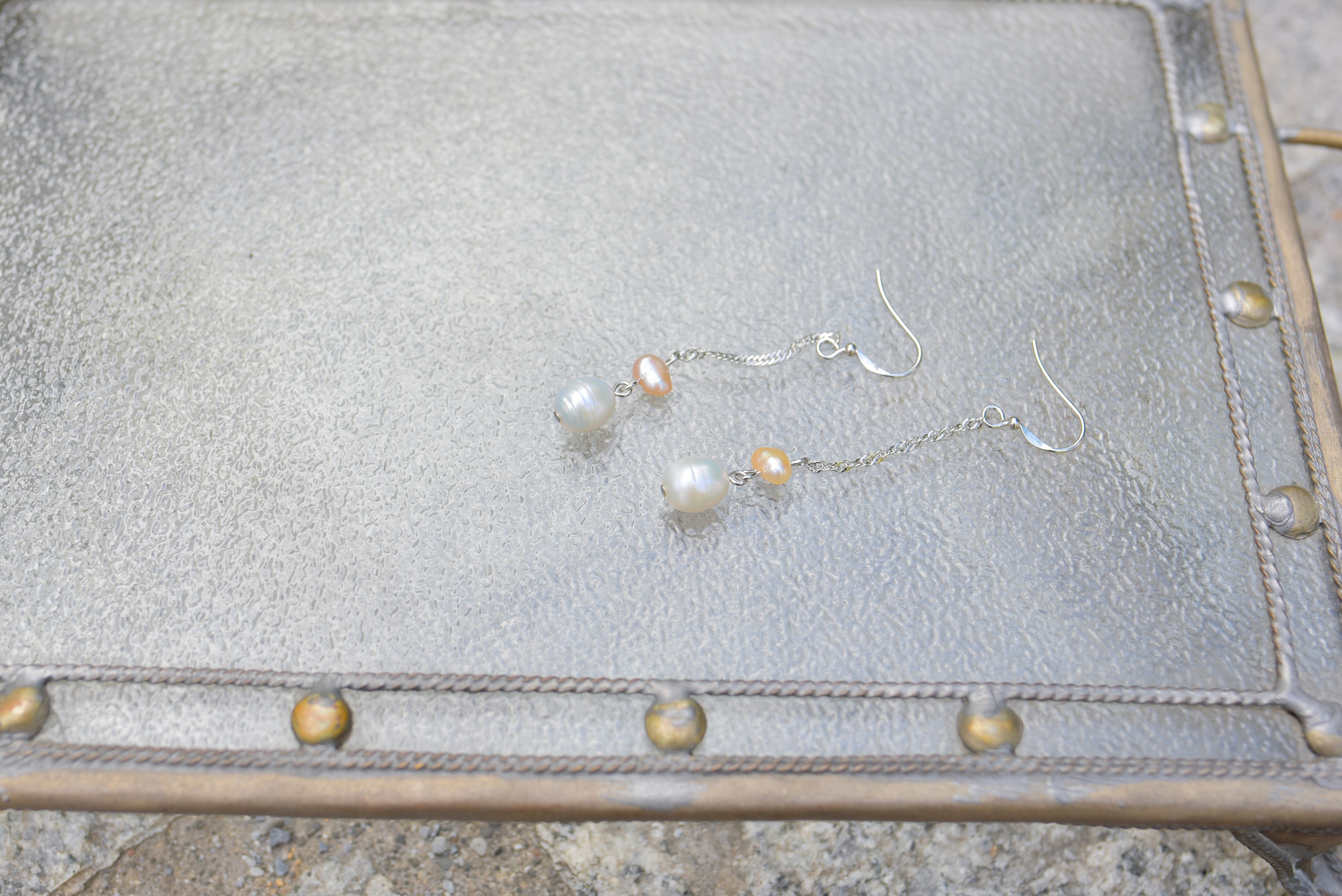 このピアスは、下部の大きめのホワイトパールの上にオレンジがかったピンクの小粒パールが組み合わさり、目を奪う存在感を持ちます。シンプルな洋服から特別な日の装飾まで、幅広いシーンで活躍するデザインです。軽やかに揺れるこのピアスは、どんなスタイルにも女性らしさを加え、あなたの魅力を引き立てます。