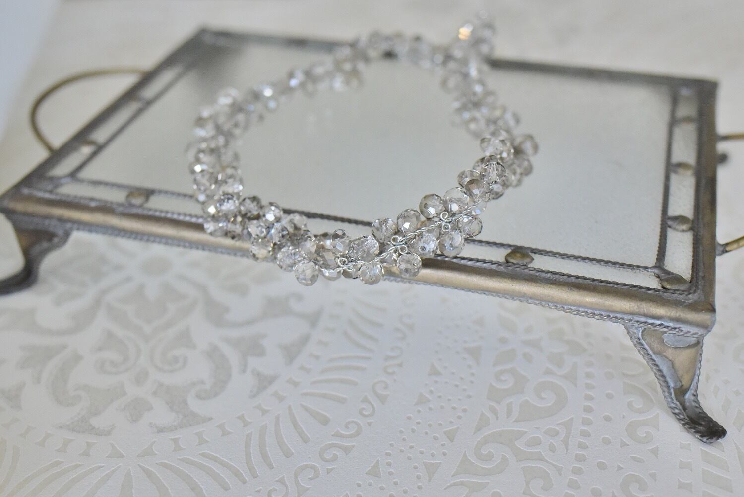 ガラスビースがとても華やか。芯のチェーン部分は針金になっていて鎖骨の上で浮かせるように形を変えられます。微妙なねじりが表現できるので光がダンラムに反射してより華やかな印象に。
