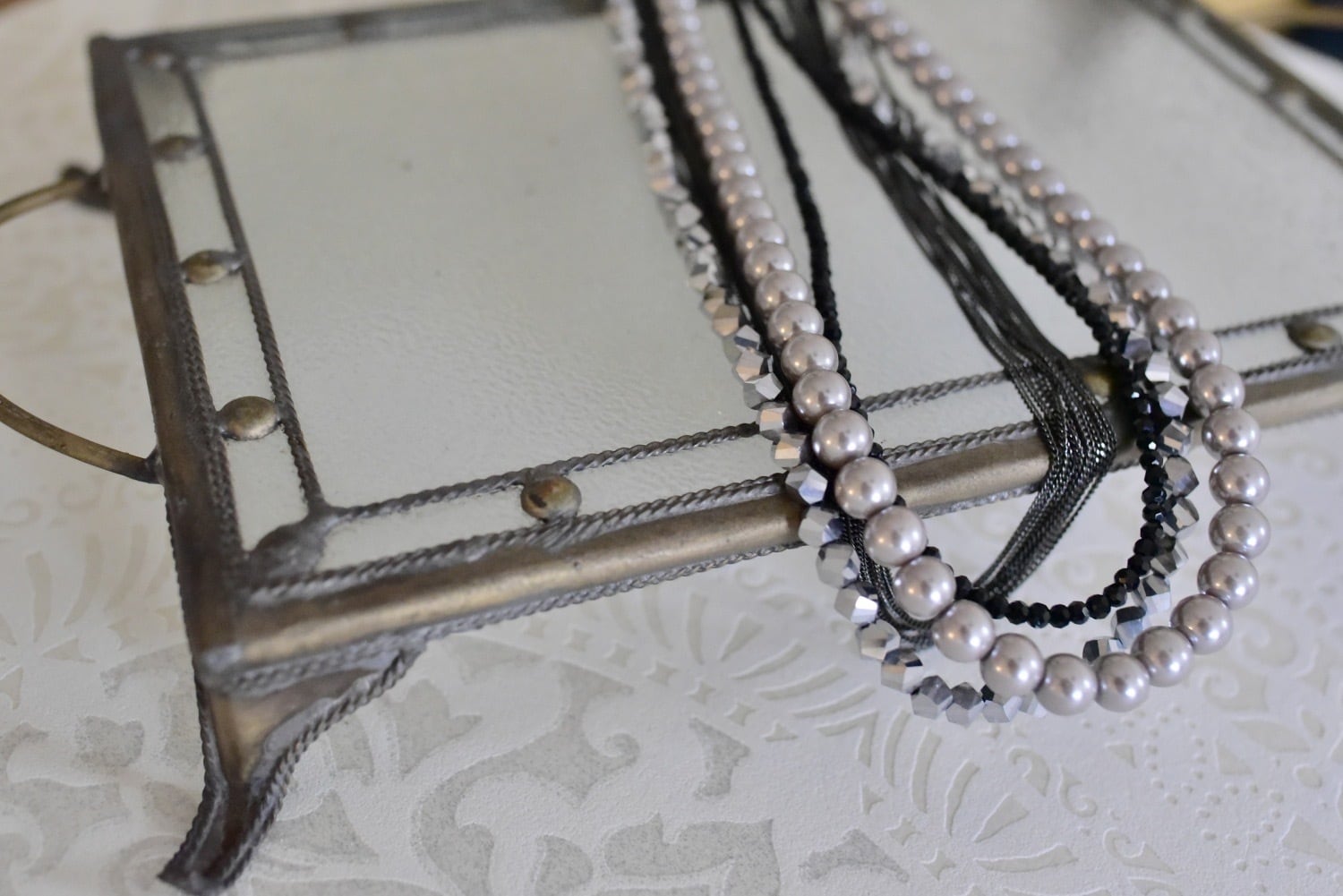 ブラックビーズ、グレーがかったパール調ビーズ、シルバーのミラーボール、チェーンが重ね付けになったようなデザインです。